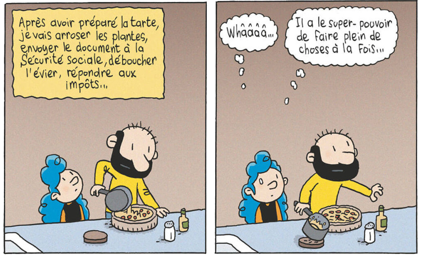 La construction narrative de l’album est classique. Chaque page propose une histoire indépendante. Il y est présenté une situation ou un questionnement qui aboutit à une chute qui fait rire et réfléchir. Évidemment, les personnages évoluent au fur et à mesure des pages. Cela crée un fil conducteur mettant ainsi en résonnance certaines planches. Cette structure d’écriture offre ainsi une lecture riche et dense. Elle autorise aussi une découverte en plusieurs fois. En effet, chaque page peut être picorée indépendamment des autres.